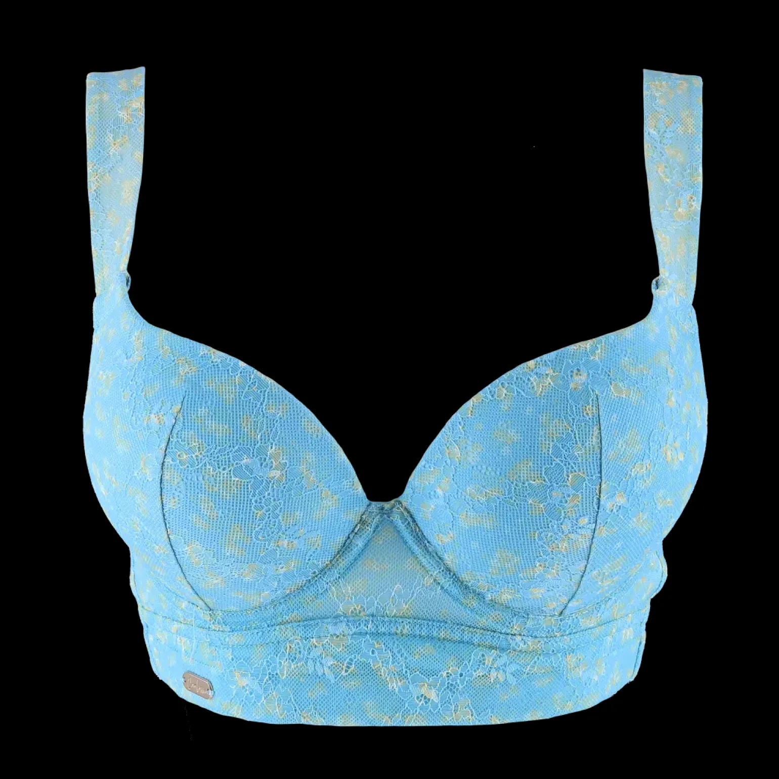 Afrodite Big Cup i lyseblå er en BH med bøyle og mye push-up i innleggene. Den er i full blonde med et nydelig blomstermønster trykket i stoffet med flott fargespill. Ment som en mer sexy versjon av vårt undertøy. Det er ikke mulig å ta ut innleggene da de har fast padding.