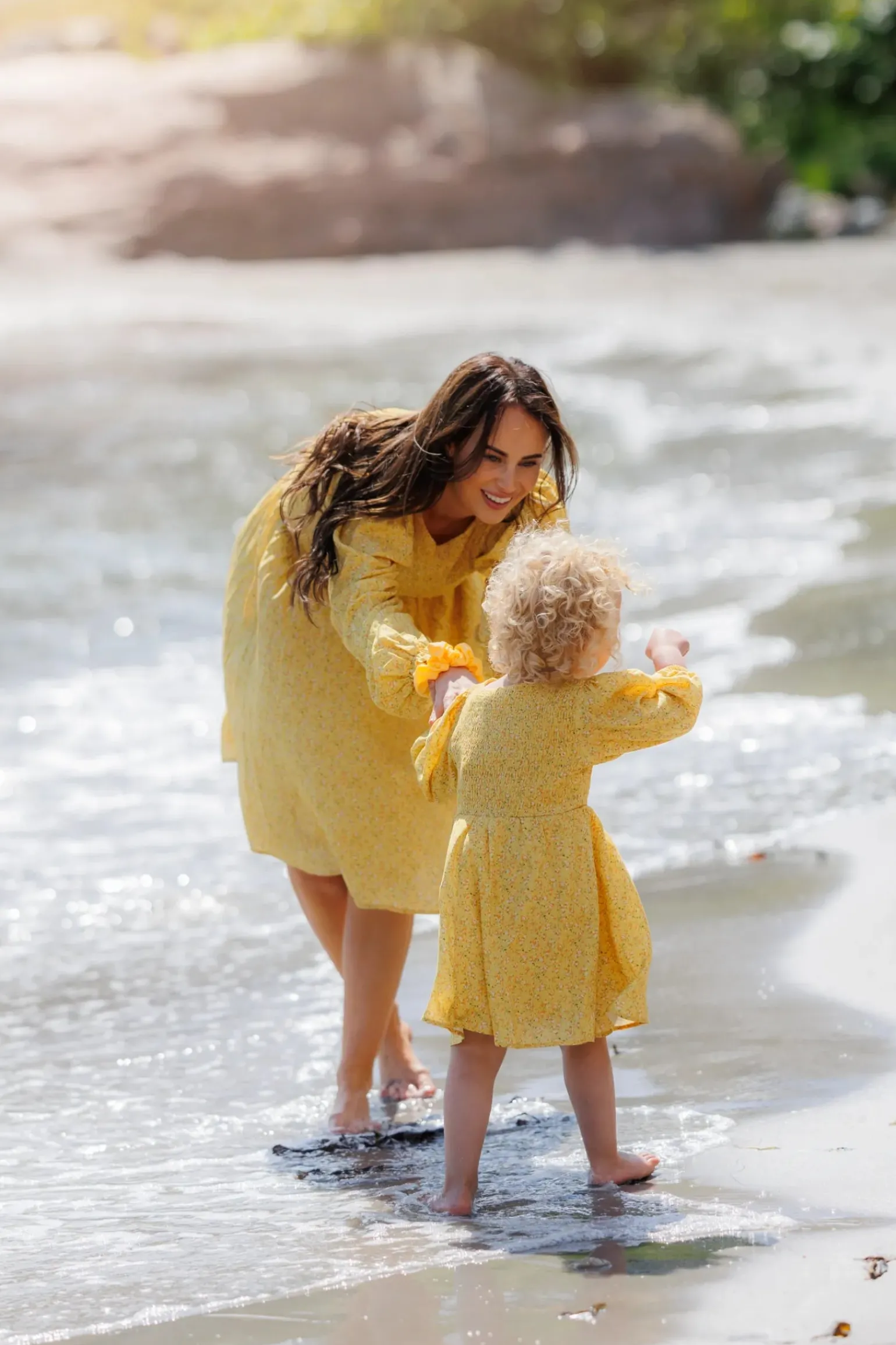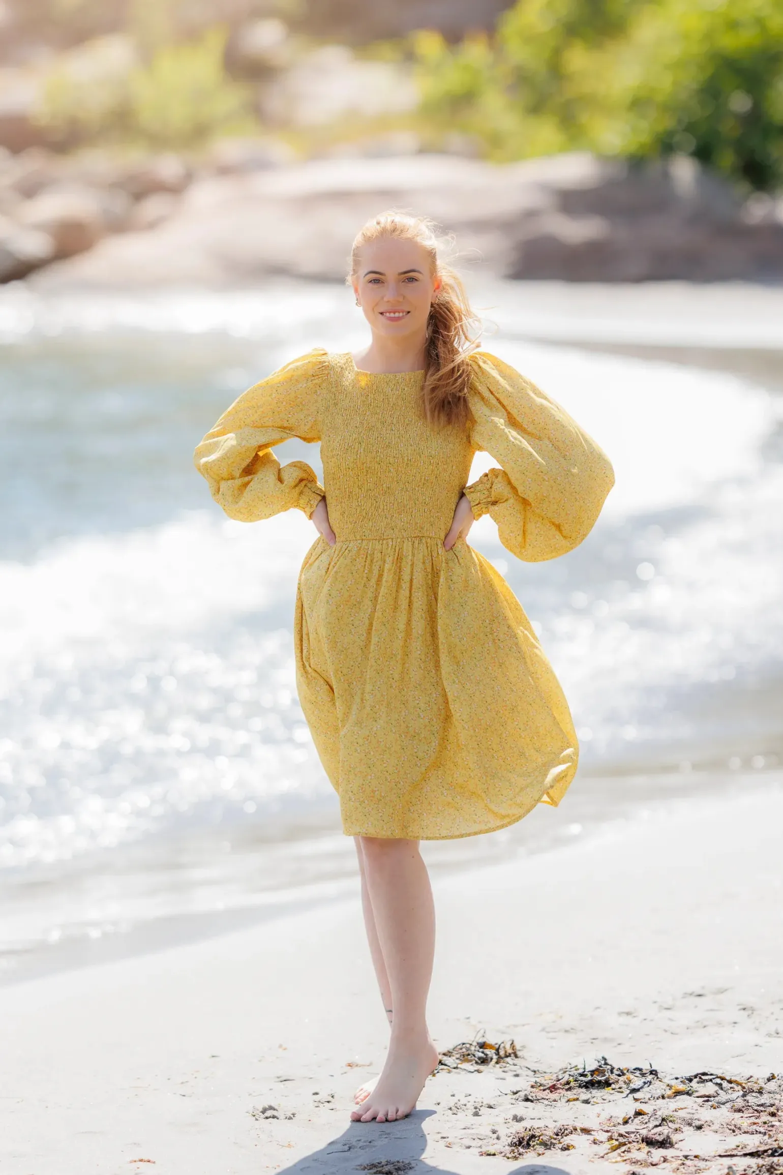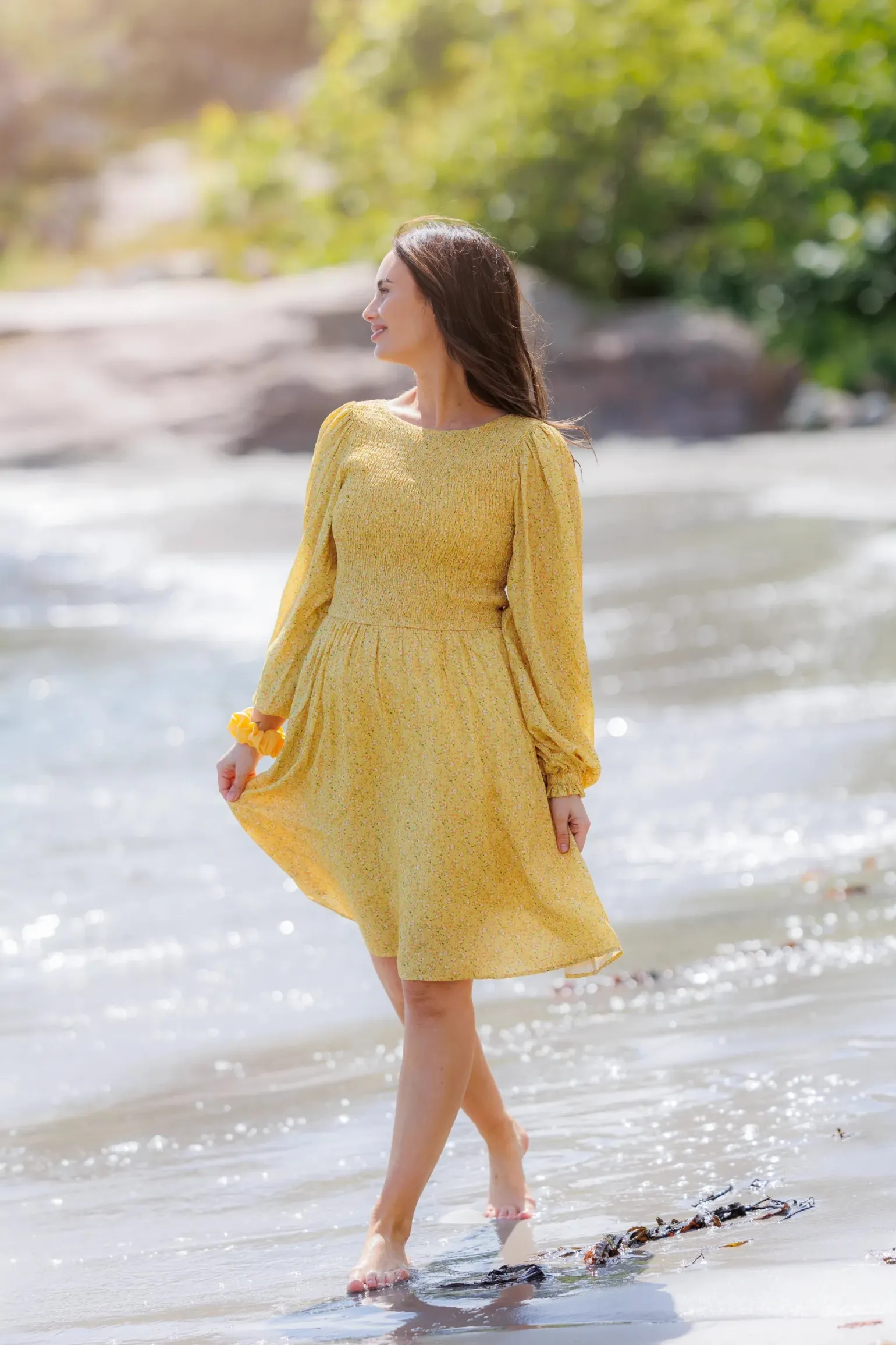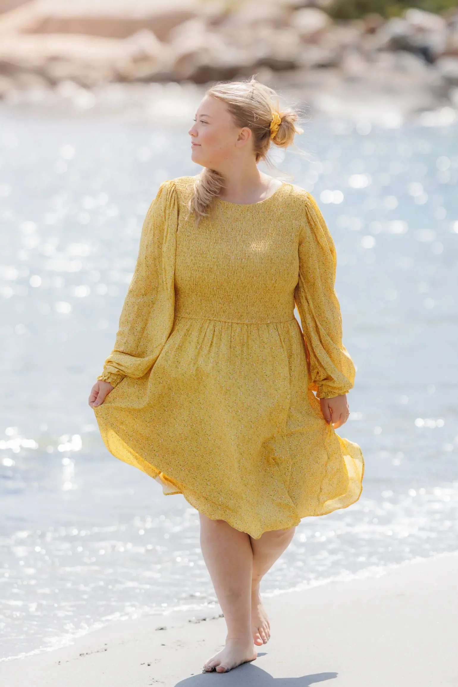 Anna kjole i gult med nydelig blomstermønster som virkelig fanger blikket!