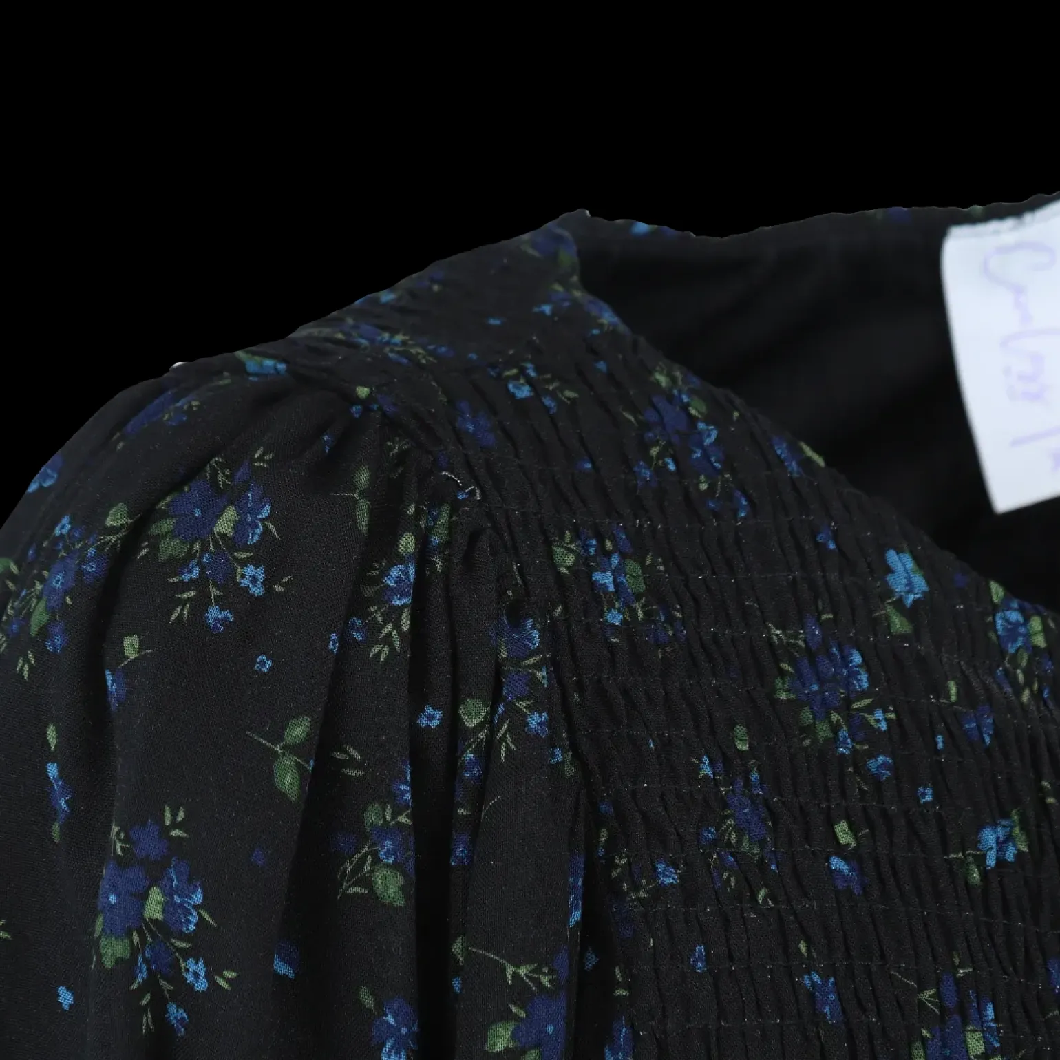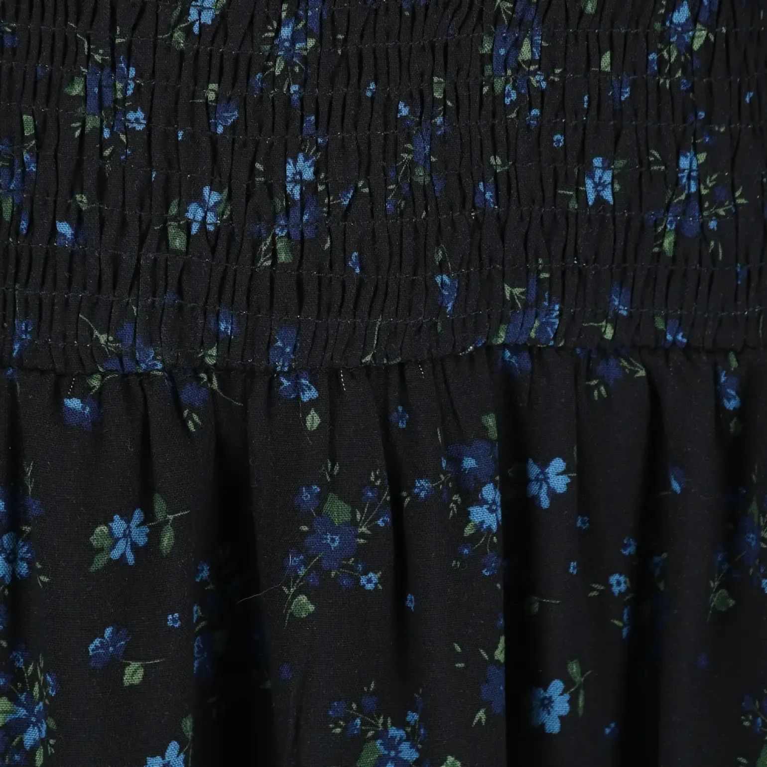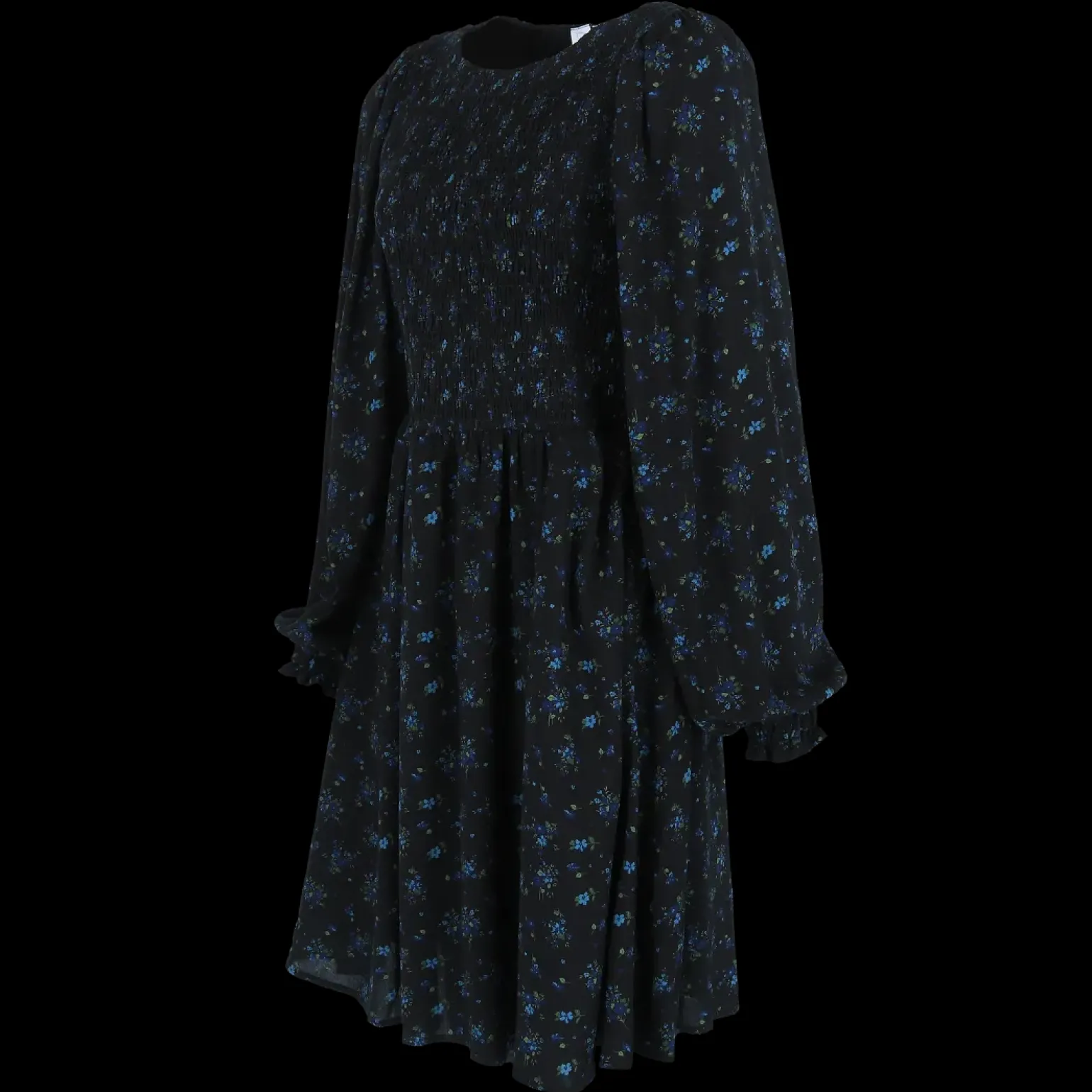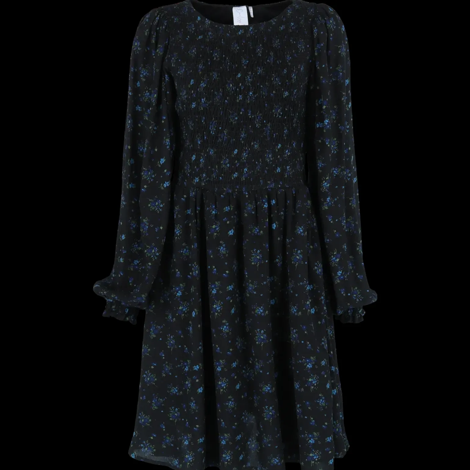 Anna kjole i mørk blå med nydelig blomstermønster som virkelig fanger blikket!