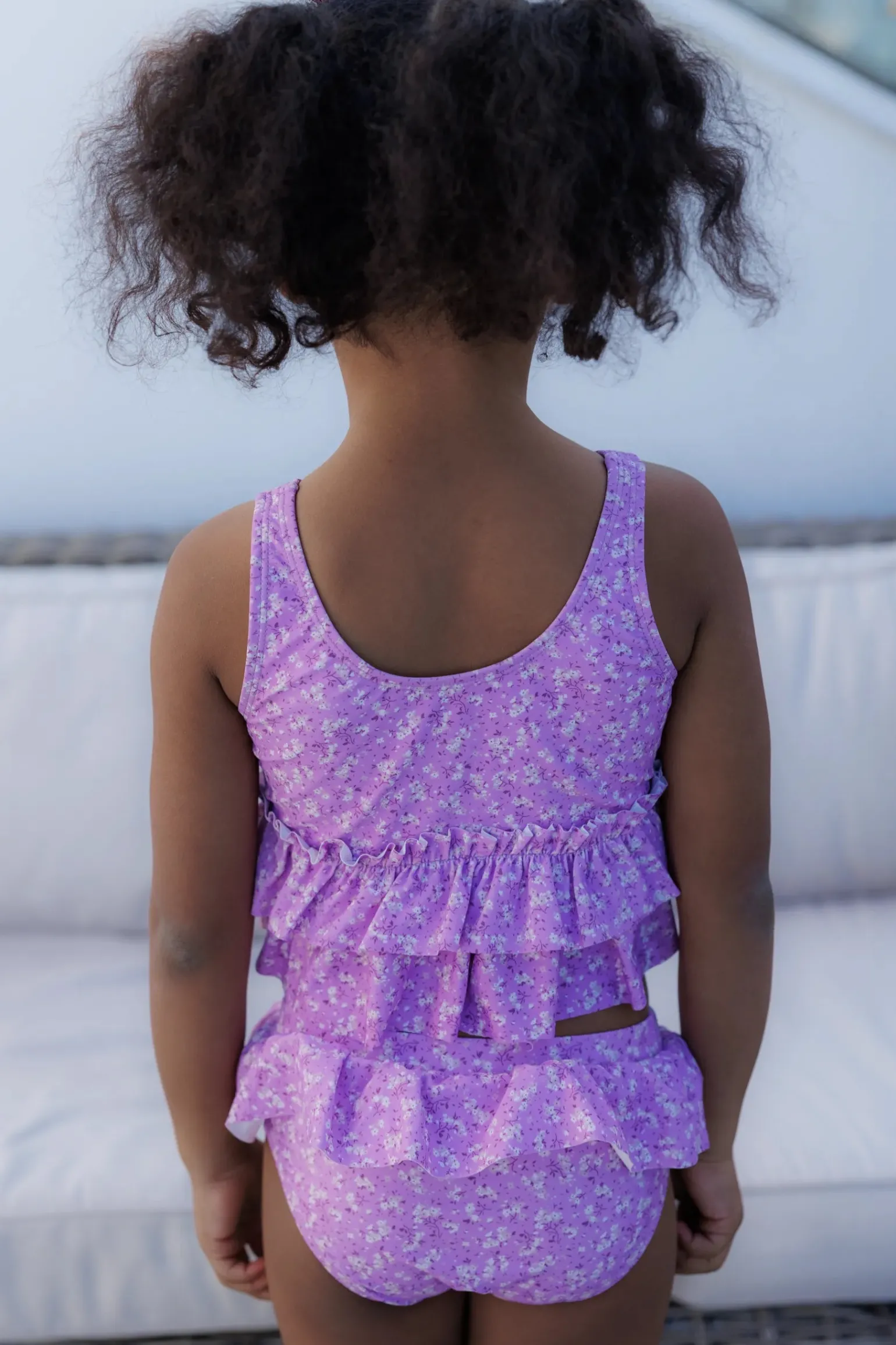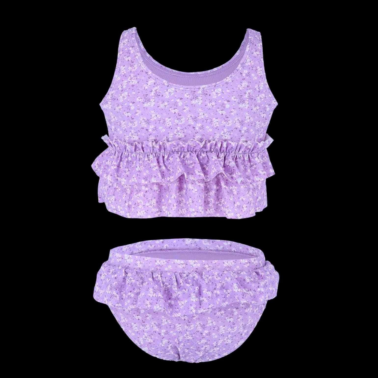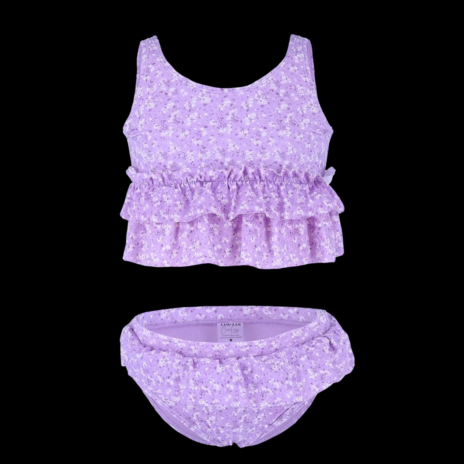 Bikini til barn i topp og truse i blomstrete print. Den var fine volanger rundt mage og hofter.